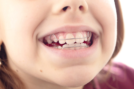 治療の説明:取り外し式の装置を口の中に入れ、こどもの成長に合わせて少しずつ歯列の幅を広げることで自然な歯並びへと誘導する矯正方法です。