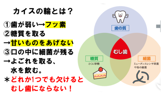歯が弱く、甘いものが好き、歯磨きをしない、この3つがそろってはじめて虫歯になります。しかし子供さんも含めて我々も甘いものを食べると幸せな気持ちになりますよね?だからこれを取り上げてしまうのはかわいそうです。では歯磨きはどうでしょうか?嫌がる子もいます。無理やり押さえつけて磨くのはかわいそうです。ではどうすればよいのでしょうか?歯の質を強くする必要があります。そのためには唾液とフッ素があります。唾液は1歳6か月まではよく出るのでそもそも虫歯になりにくいですがそれを超えるとむし歯になるリスクが上がっていきます。水分を取ることによって唾液が出るので、こまめに水分を取ることを推奨します。フッ素は毎日塗ることに意味があります。フッ素はなんでもいいわけではなくて子供では950ppmのものを推奨します。歯科医院で塗布するフッ素は約10倍の濃度なので、定期的に塗ることが大事です。第一大臼歯というご飯を食べる大事な歯があります。幼若永久歯といって、歯が生えかけの時が一番フッ素を取り込むことができます。それは6~9歳の間です。